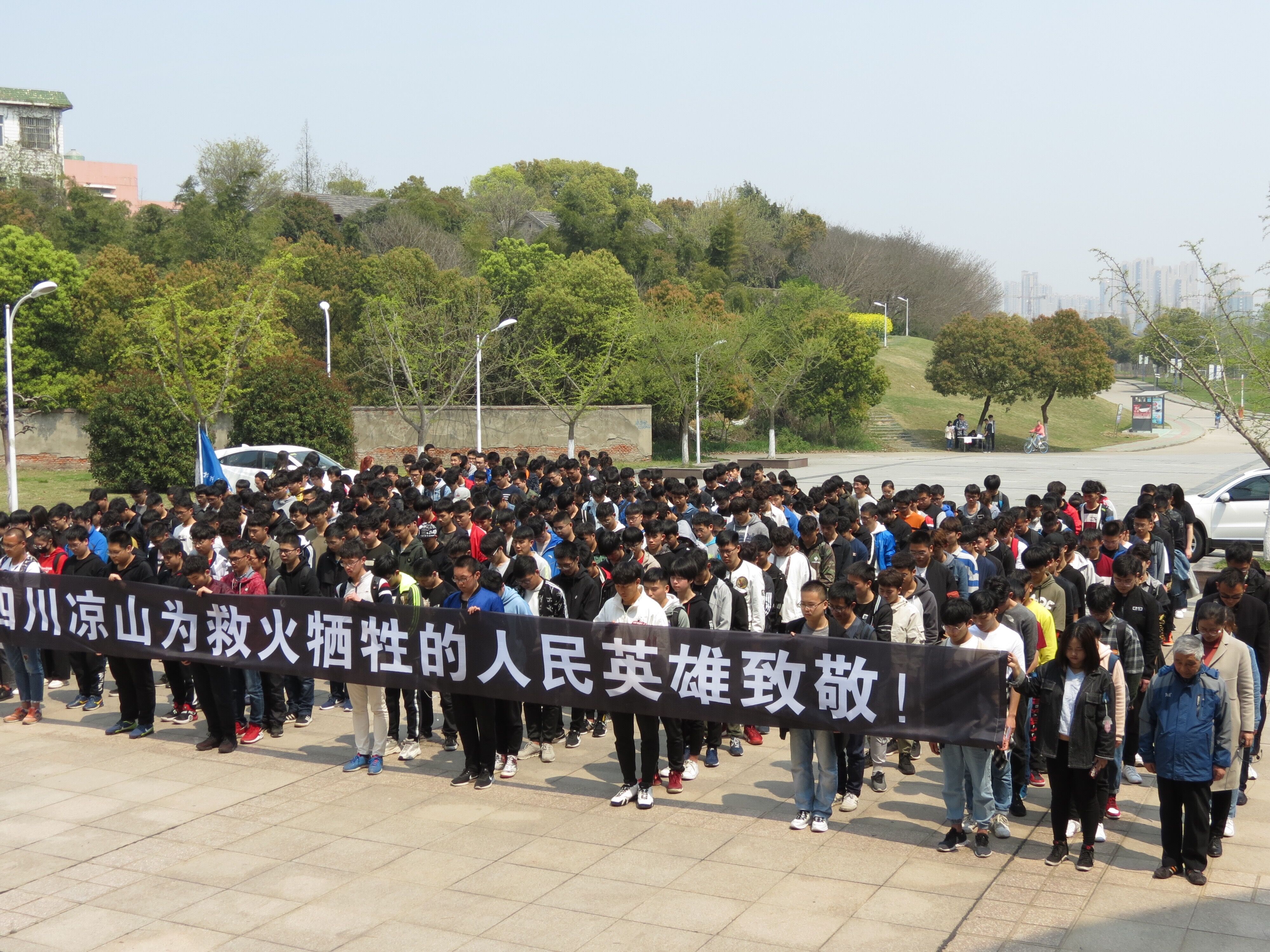 “痛悼!向四川凉山为救火牺牲的人民英雄致敬!”活动现场,这样一条横幅极为醒目。图书馆前,全体师生列成整齐的方阵,低头肃穆,为3月30日在四川凉山大火中牺牲的30名英雄默哀。一分钟的时间被哀思冻结,全体人员以沉重的心情缅怀逝者,悼念逆火而行的英雄们。