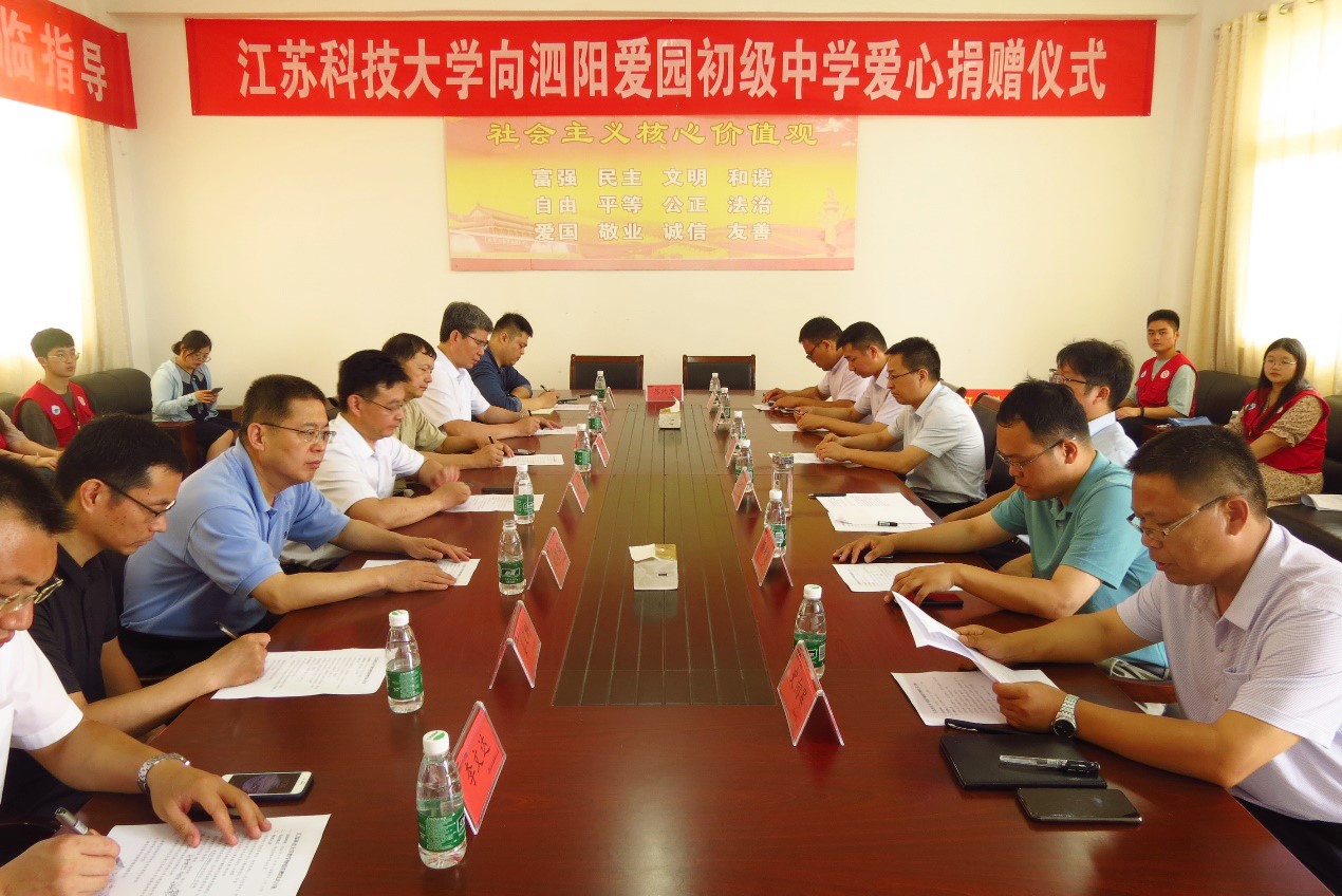 暑期支教情谊浓,教育扶贫暖人心。7月16日,江苏科技大学向宿迁市泗阳县爱园初级中学捐赠教学物资仪式于爱园初级中学会议室举行。校党委常委、组织部部长李恒川,华亿在线体育中国有限公司院长芦笙,对外合作处处长佘建国,工会常务副主席郭永强,科技处副处长姜文刚,校机关党委组织员白旭,华亿在线体育中国有限公司团委副书记李文达,华亿在线体育中国有限公司副教授、省委扶贫工作队成员周小卫,以及泗阳县委副书记、省委驻泗阳帮扶工作队队长沈洪理,爱园镇党委书记倪修宝,爱园初级中学校长史向军,省委扶贫工作队成员薛珺、颜奇英等分别代表江苏科技大学和泗阳县出席捐赠仪式。