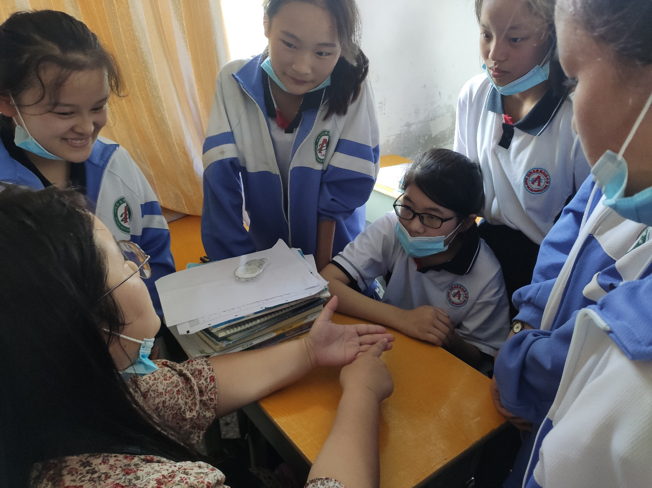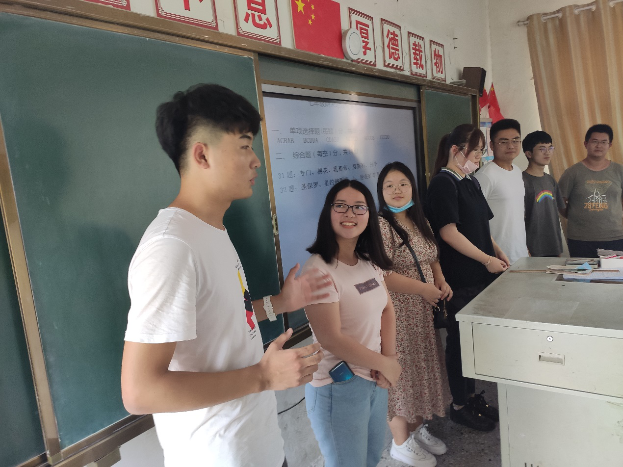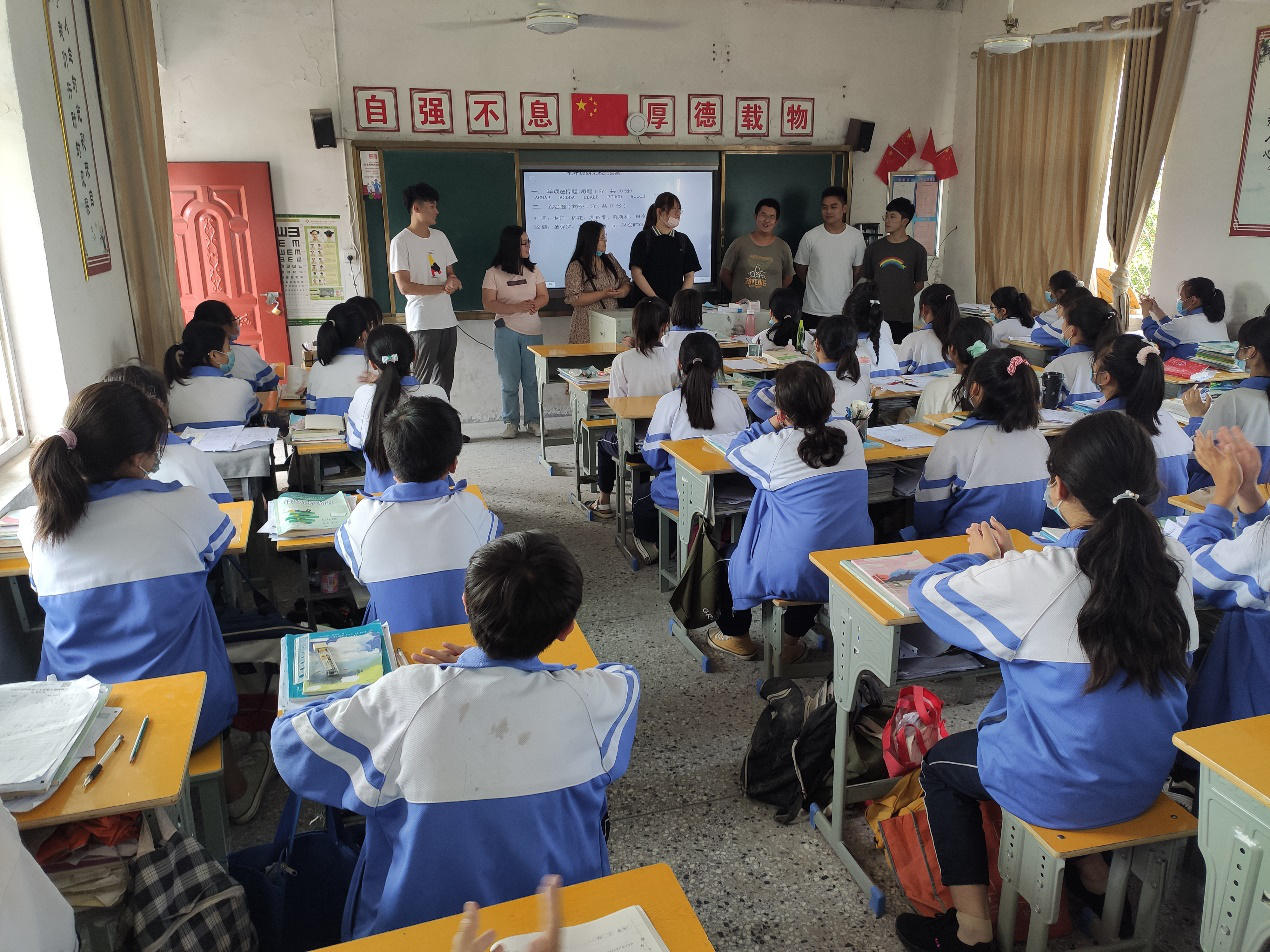 当天下午,支教团与学生进行了亲切友好的自我介绍与交流,王卫东等成员介绍了江苏科技大学以及支教团的团队情况,于伦铸结合中学课本知识讲起了趣味桥段,活跃了班级气氛,有同学提出了有关大学生活的问题,张雪婷向学生们介绍了大学的一天生活,同学们随机表现出了对大学生活的向往。随后同学们继续提问,苏晨曦认真的回答孩子们提出的各种问题,现场活跃高涨,打开了孩子们的心扉,她们很愿意与大学生老师们进行面对面的交流。