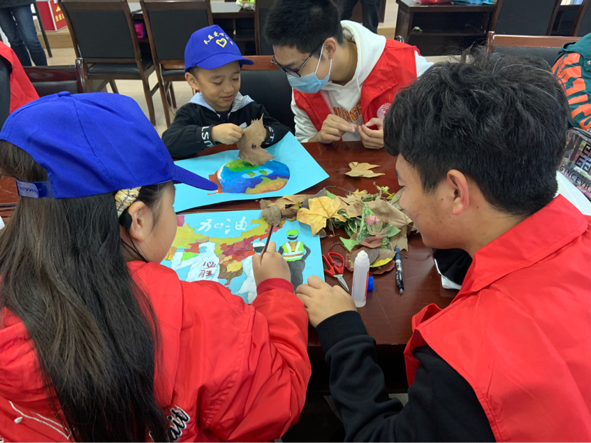活动过程中,七名志愿者与小朋友们一起合作用落叶进行贴画。志愿者打开准备好的画作,指导小朋友通过比对图形,找出形状相似的落叶,并将其剪裁后用胶水贴上,与画作融为一体。贴画期间,小朋友们发挥了天马行空的想象力,在画作上添加了许多新的元素。有的小朋友拼出了白衣天使的样子,有的小朋友写下了“加油”,还有的画上了自己认知中的病毒。他们的创意与原画完美贴合,融进画里的不仅是小朋友们的创意,更是他们对抗疫英雄的敬仰以及对抗疫行动的深刻感受。对病毒举起的矛与盾代表的是对新冠的抗击,火神山雷神山是对中国速度的深刻见证……