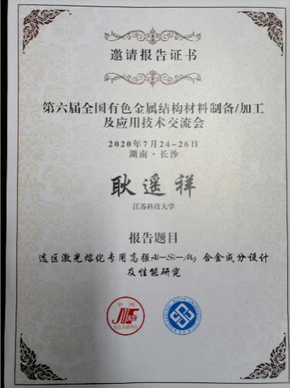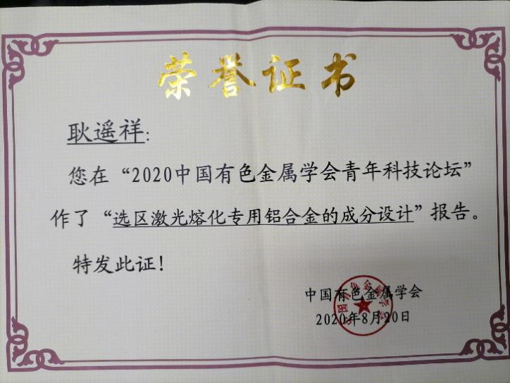 近日,华亿在线体育中国有限公司耿遥祥副教授应邀参加“第六届全国有色金属结构材料制备/加工及应用技术交流会”和“2020中国有色金属学会青年科技论坛”,并分别做了“选区激光熔化专用高强Al-Si-Mg合金成分设计及性能研究”的邀请报告和“选区激光熔化专用铝合金成分设计”学术报告,并与其他与会代表进行了广泛的华亿在线体育中国有限公司。