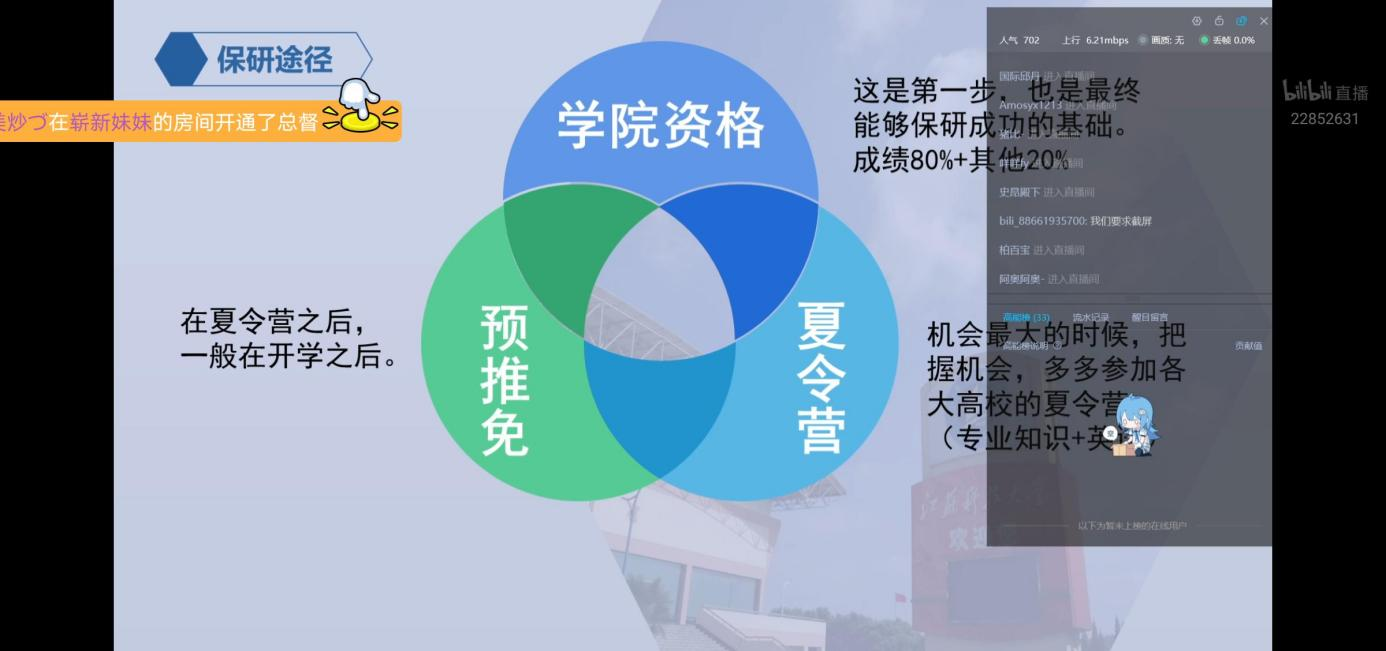 分享会上,徐佳宁同学从保研前期准备和保研途径,并结合自身经历分享自己的保研路,告诫考研学子要坚持自己的目标,不要中途放弃。常皓博同学从为什么考研、考研常识和怎么复习等方面给大家的备考提出了中肯的建议,细致地描述了如何进行三轮复习,以及如何调整自己的状态。最后,两位同学对备考学子提出的疑问进行了解答,并提供了建议性的意见和建议。