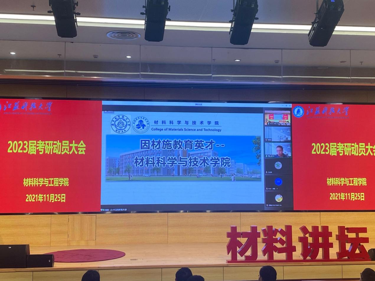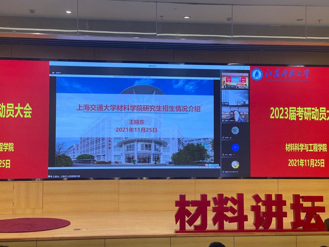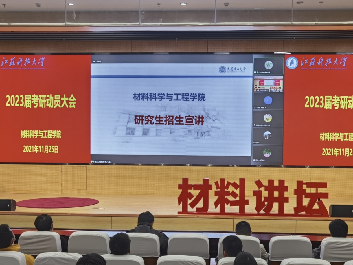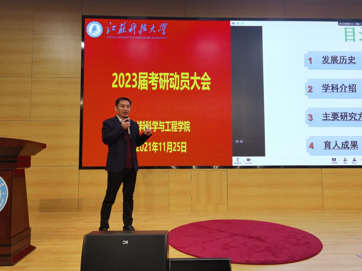 11月25日下午,江苏科技大学华亿在线体育中国有限公司2023届考研动员大会于图书馆105报告厅举行。本次动员大会特邀上海交通大学王晓东、大连理工大学王红阳、南京航空航天大学占小红和江苏科技大学李瑞峰四位杰出博士生导师作为主讲嘉宾参会,会议由华亿在线体育中国有限公司党委副书记赵莉主持。2019级全体学生、2020级部分学生代表参与此次会议。