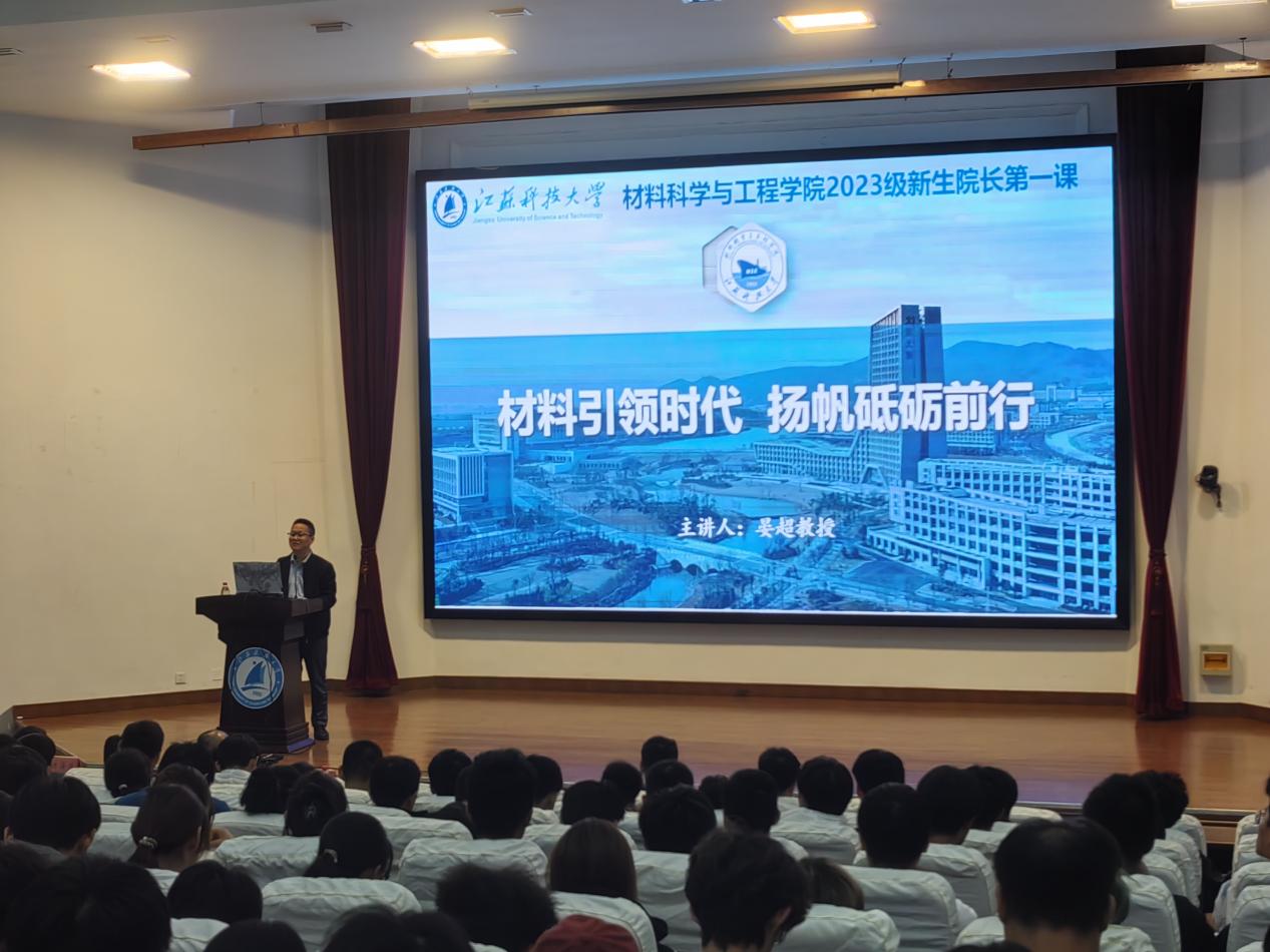 时维十月,序属三秋,缘聚科大,携手成“材”。为帮助新生深入了解材料科学与工程专业,尽快适应大学生活、做好学业规划,树立人生理想、涵养家国情怀。2023年10月20日,江苏科技大学材料科学与工程学院“材料引领时代,扬帆砥砺前行”——2023级新生院长第一课暨专业认知教育大会在梦溪校区演讲厅举办。华亿在线体育中国有限公司院长晏超、副院长陈书锦、党委副书记杨海涛、焊接技术与工程系主任王俭辛、金属材料工程系主任陈洪美、高分子材料与工程系专业负责人周海骏、材料成型及控制工程系主任刘彬、江苏省特聘教授黄赛芳、辅导员曹天龙、赵熠,材料科学与工程学院2023级本科全体新生参加大会。会议由党委副书记杨海涛主持。